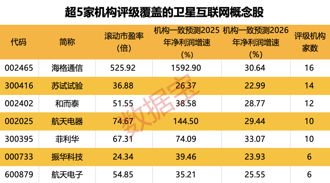 从机构关注度来看,最新超5家机构给予评级报告的概念股有7只,其中机构一致预测2025年净利润增长率超过50%的有3只,分别为海格通信、航天电器、菲利华;2026年净利润增长率超过30%的有2只,分别为菲利华、海格通信。
