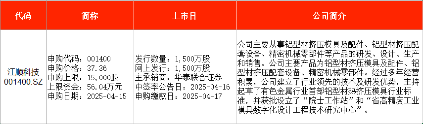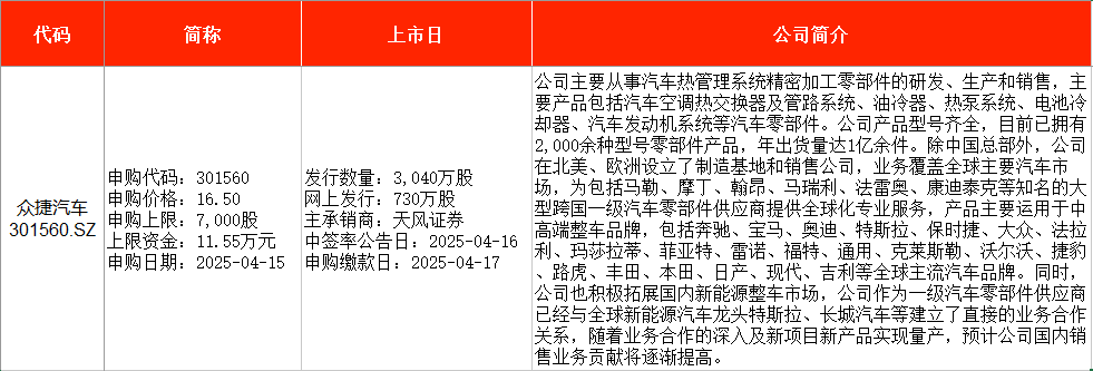 从时间表看,天有为在周一(4月14日)申购,众捷汽车、江顺科技则在周二(4月15日)申购。