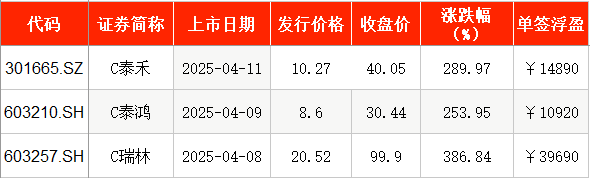 4月11日,泰禾股份在深圳证券交易所创业板正式挂牌上市,发行价为10.27元/股,截至上市首日收盘,该股报40.05元/股,涨幅为289.97%。以收盘价计算,投资者中一签浮盈为14890元。