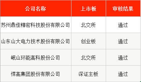 发审委审核方面,深交所、北交所上周均召开新一期上市审核委员会审议会议。其中,拟在北交所上市的苏州鼎佳精密科技股份有限公司(下称“鼎佳精密”)、岷山环能高科股份公司(下称“岷山环能”)均成功过会;拟在创业板上市的山东山大电力技术股份有限公司(下称“山大电力”)、拟在深证主板上市的悍高集团股份有限公司(下称“悍高集团”)也成功过会。