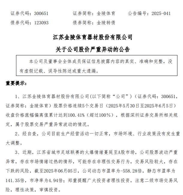6月5日晚间,连续3个20%涨停的金陵体育(300651.sz)发布股价严重异动公告称,公司股票价格连续5个交易日收盘价格涨幅偏离值累计达到100.41%(超过100%),属于股票交易严重异常波动的情况。