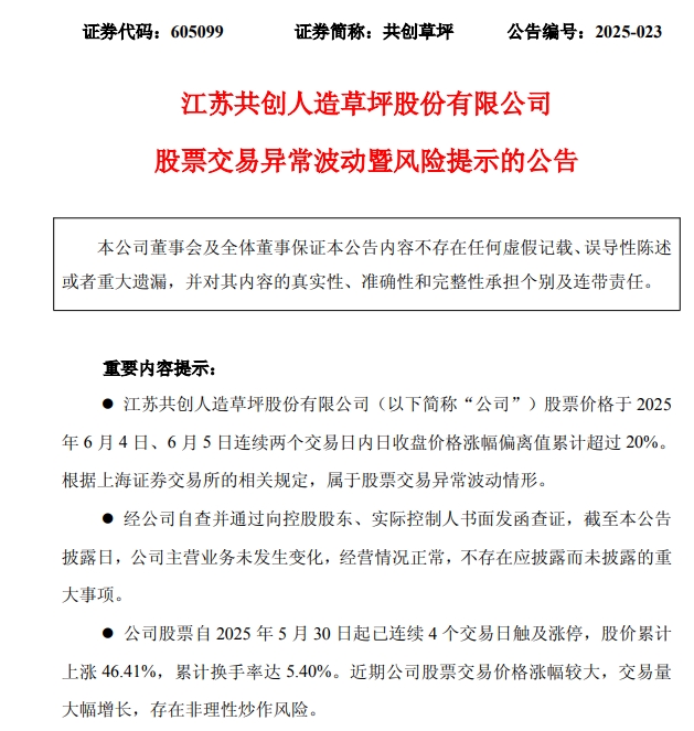另一只4连板的龙头股共创草坪(605099.sh)也于同日晚间公告称,近期公司股票交易价格涨幅较大,交易量大幅增长,存在非理性炒作风险。公司关注到近期江苏省城市足球联赛受到市场关注的热度较高。