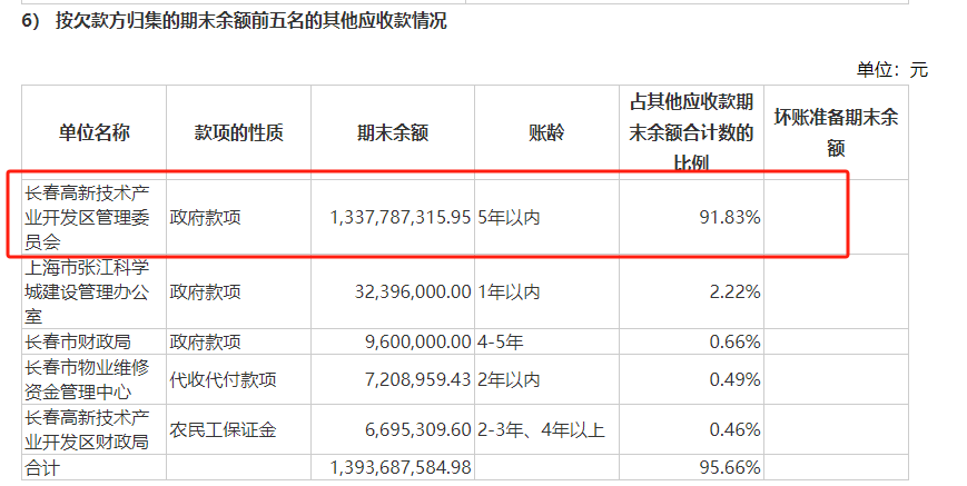 根据2023年财报数据,确实有一笔来自长春高新技术产业开发区管理委员会的应收账款,该笔款项为13.38亿元,占公司应收账款的91.83%,账龄5年以内。