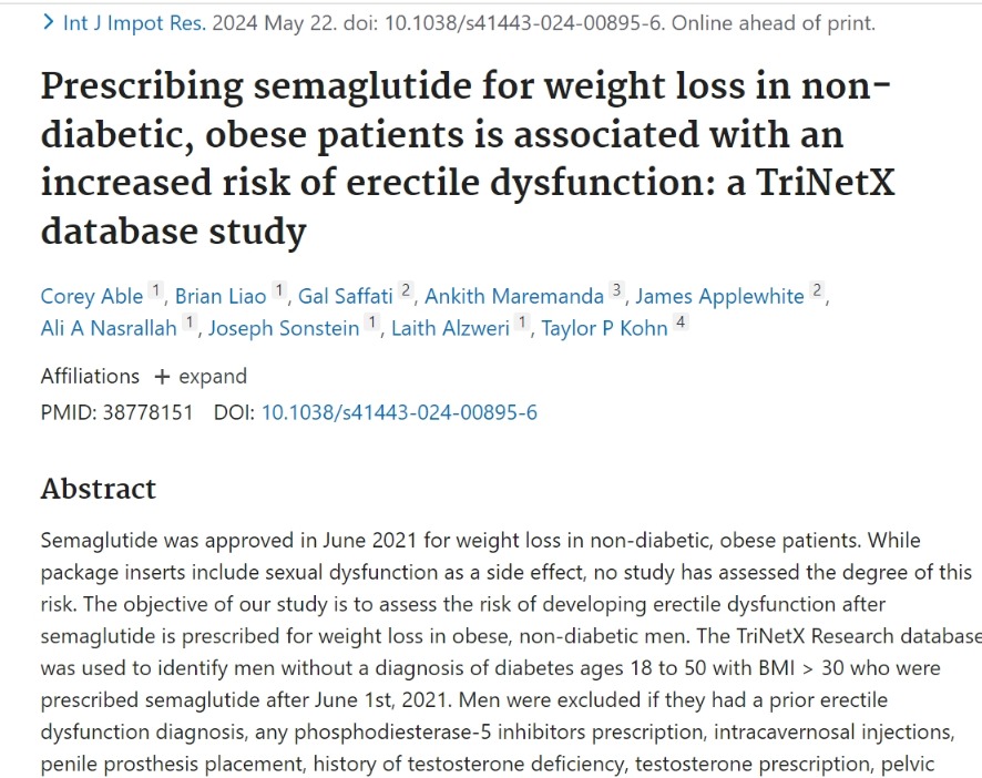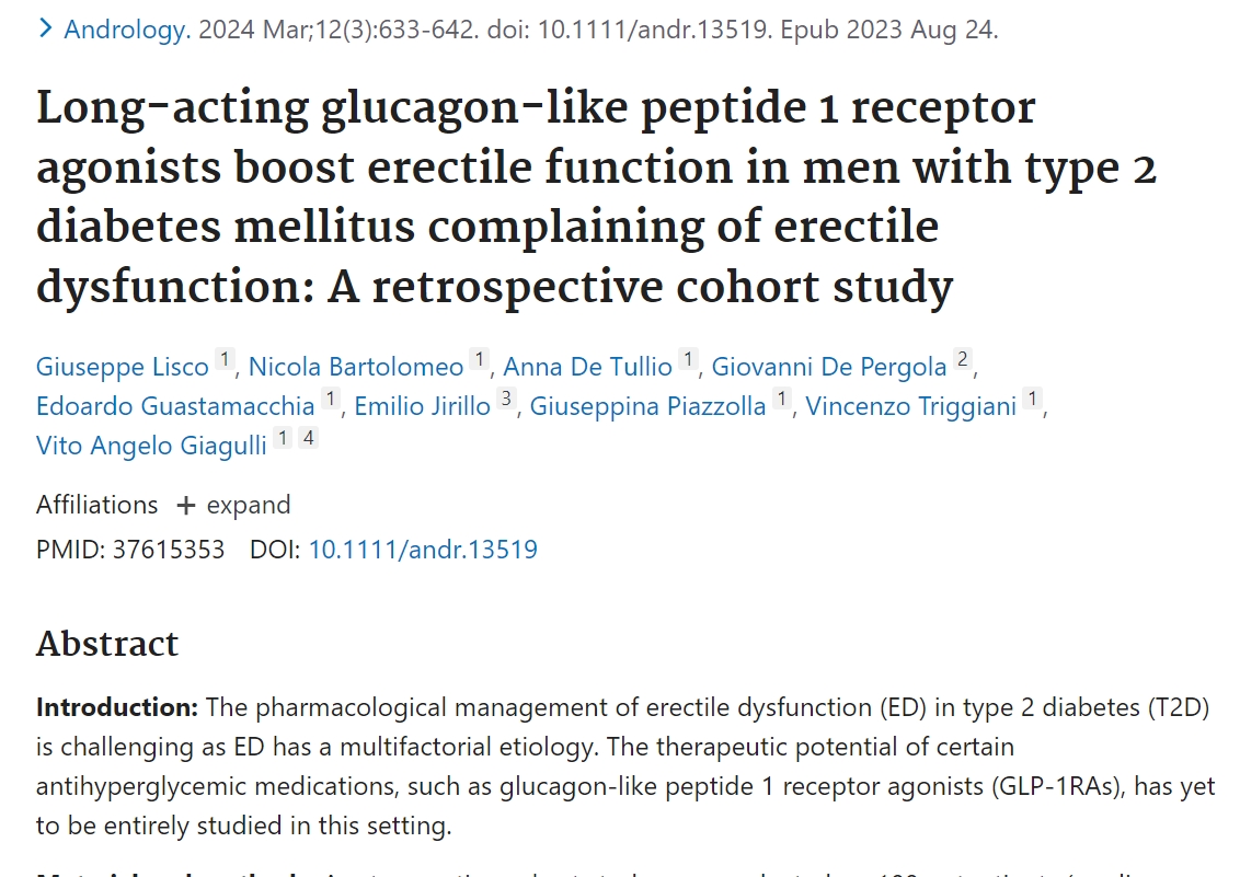 实际上,2023年底,就有报道提及司美格鲁肽可能与ed有关,但当时并未引发大范围关注。此外,2024年3月,andrology发表的一篇论文则给出了几乎相反的结论,即司美格鲁肽可以改善男性性功能。这是一项回顾性研究,选择的是糖尿病患者群体。