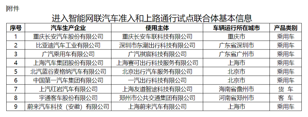 按照《关于开展智能网联汽车准入和上路通行试点工作的通知》(工信部联通装〔2023〕217号)有关工作安排,经汽车生产企业和使用主体组成联合体自愿申报、车辆拟运行城市人民政府同意、所在地省级主管部门审核推荐,工业和信息化部、公安部、住房城乡建设部、交通运输部(以下统称“四部门”)组织专家对首次集中申报的方案进行了初审和择优评审,研究确定了9个进入试点的联合体(基本信息见附件)。