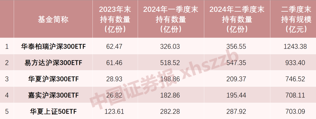综合2023年年报、2024年一季报、2024年二季报来看,今年二季度,中央汇金投资有限责任公司(中央汇金)分别增持28.83亿份易方达沪深300etf、30.51亿份华泰柏瑞沪深300etf、12.58亿份嘉实沪深300etf、10.51亿份华夏沪深300etf、5.64亿份华夏上证50etf、8.33亿份南方中证500etf。