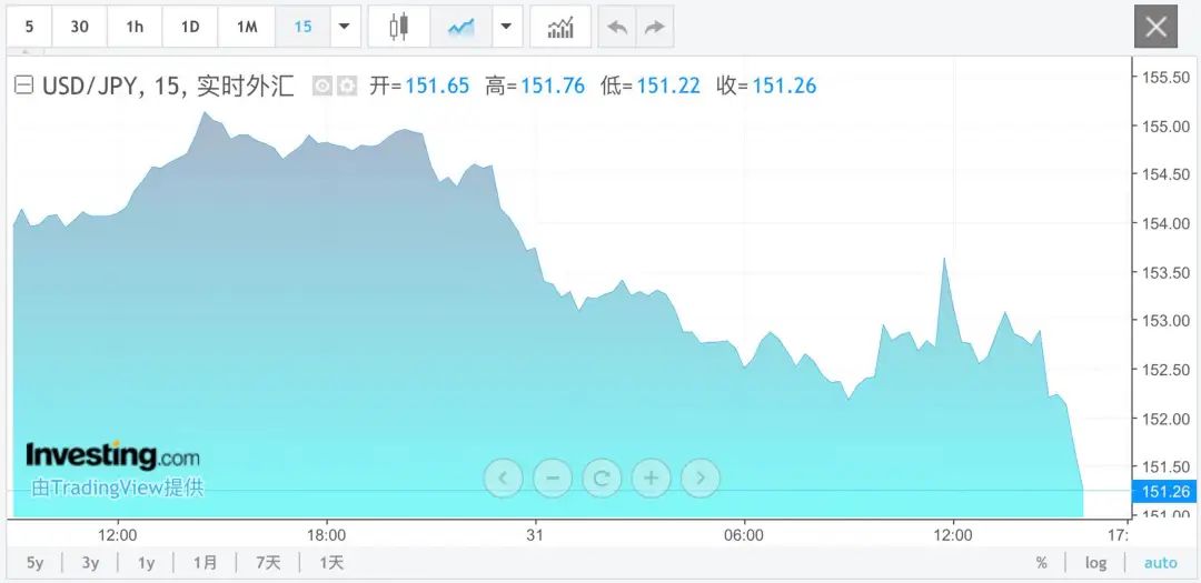 在日本央行宣布加息后,美元兑日元汇率持续下挫,现已跌破152关口,报151.26,日内一度大跌超1%。