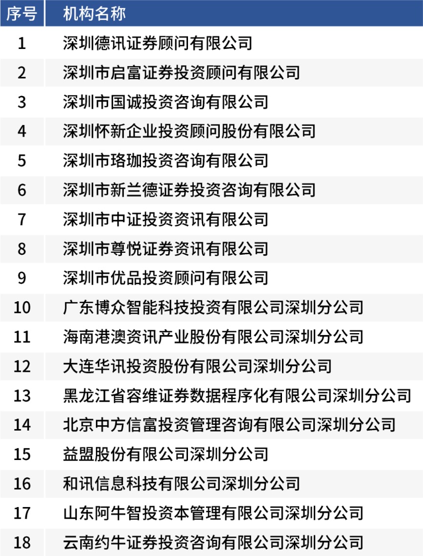 截至10月31日,深圳辖区共有18家证券投资咨询机构,包括深圳德讯证券顾问有限公司、深圳市启富证券投资顾问有限公司、深圳市国诚投资咨询有限公司等。
