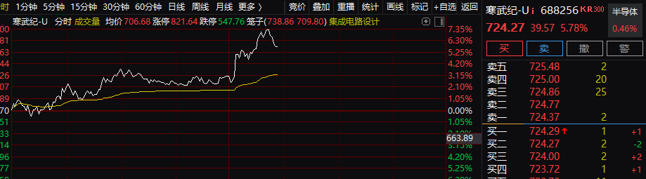 午后,国产替代概念股因上述消息暴涨,寒武纪一度大涨超7%。