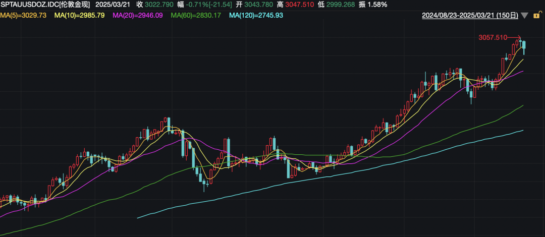 自去年以来,黄金价格持续上涨,频频刷新历史新高,3月20日,伦敦现货黄金盘中创下3057.51美元/盎司的历史高点。3月21日,国际金价出现回调,伦敦现货黄金价格最低触及每盎司2999.268美元;comex黄金期货跌至每盎司3028.2美元,下跌0.51%。