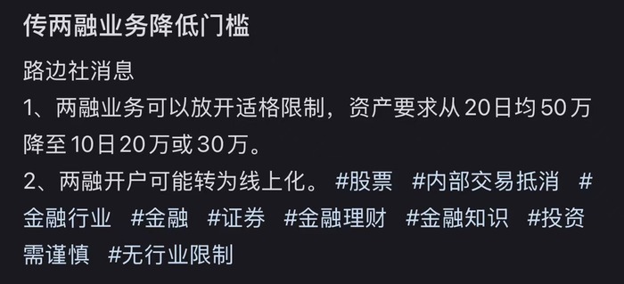 该传闻称:“两融业务可以放开适格限制,资产要求从20日均50万降至10日20万或30万;两融开户可能线上化。”