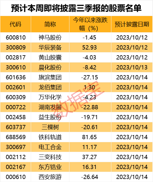 根据三季报披露时间,本周还将有15股发布三季报。其中包含年内股价表现较好的铁科轨道、华辰装备等。