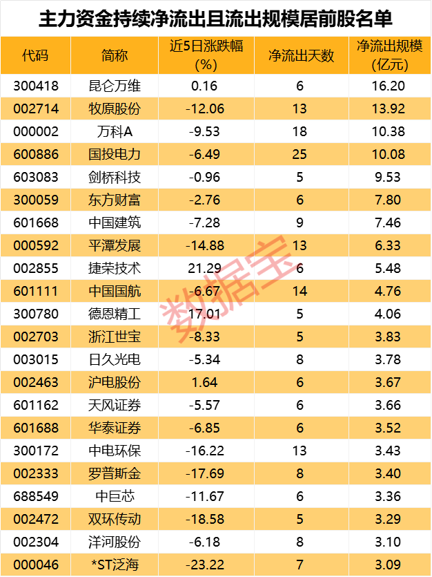 从主力资金净流出总规模来看,昆仑万维主力资金净流出金额最大,连续6天累计净流出16.2亿元,牧原股份、万科a、国投电力的主力净流出额均超10亿元。