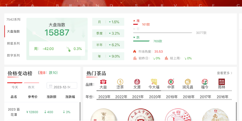 以某找茶平台为例,其k8凯发赢家一触即发首页中不仅清晰列明茶叶的大盘指数,还有细分板块的实时热度指数。而在具体茶品中,不仅会列明价格走势、参考报价、撮合买卖、涨跌排行榜,同时还可以购买“散片”(茶叶术语,每片重357克)。该平台自身也可提供鉴定、买卖服务,买卖范围覆盖多款热门茶品。