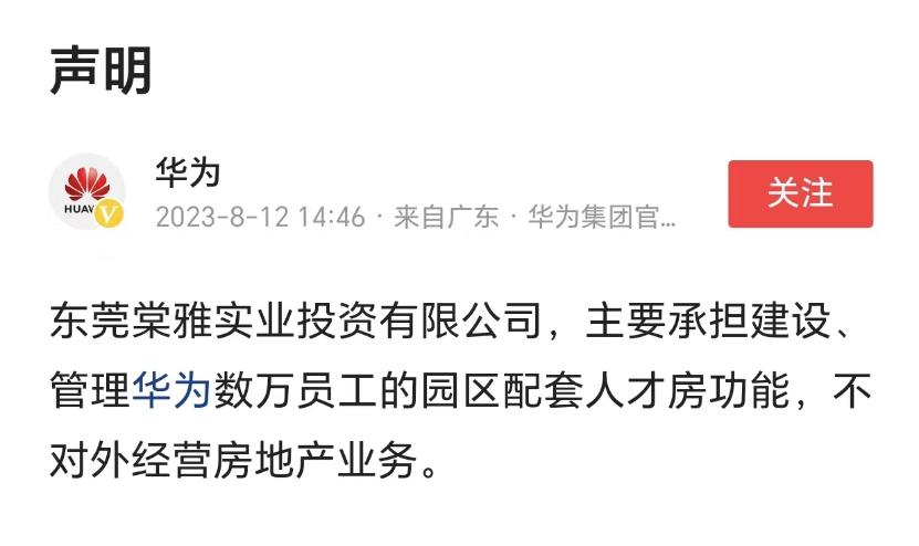 对此,8月12日,华为官方正式发布声明称,公司所成立的东莞棠雅实业投资有限公司,主要承担建设、管理华为数万员工的园区配套人才房功能。华为不对外经营房地产业务。