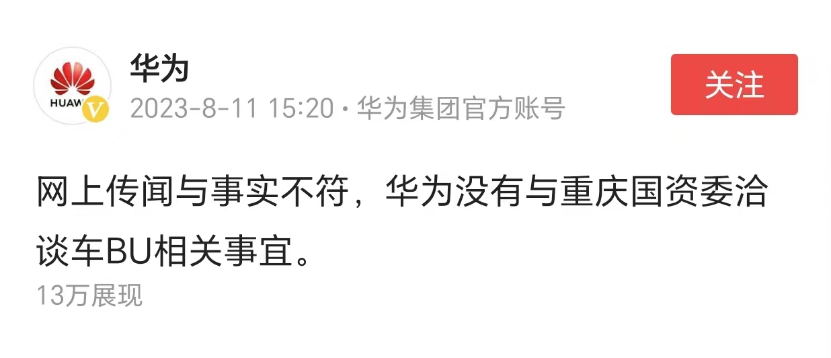此外,还有报道称,华为有意推动车bu独立运营,目前正与重庆国资委密切接洽合作事宜,多名人士评价“相关形式,类似‘荣耀’单飞”。对此,华为也表示,网上传闻与事实不符,华为没有与重庆国资委洽谈车bu相关事宜。
