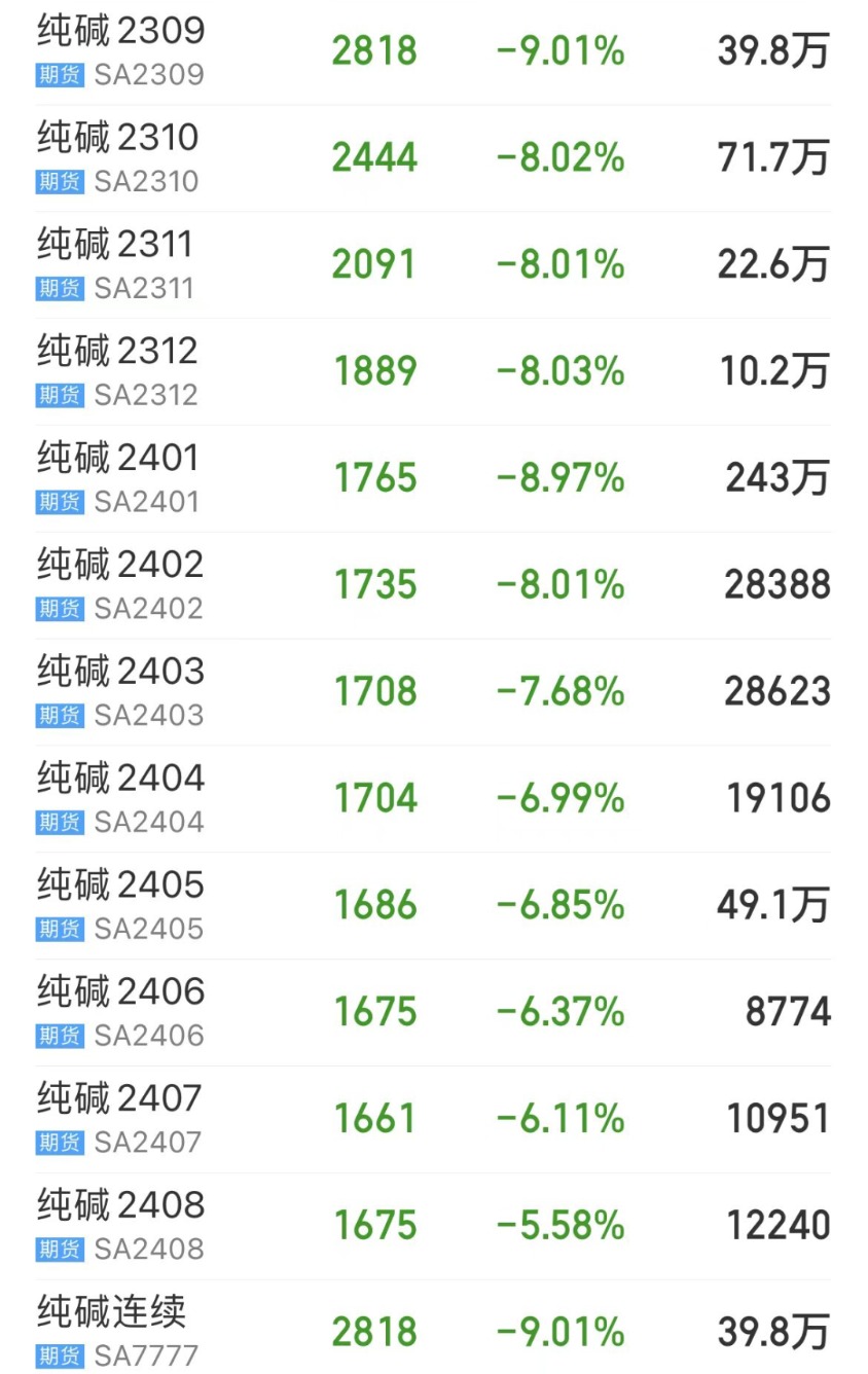 今日,纯碱期货合约全线下挫出现大面积跌停。主力sa2401合约盘中一度触及跌停,跌幅达9%。sa2309、sa2310、sa2311、sa2312、sa2402等合约均触及跌停。