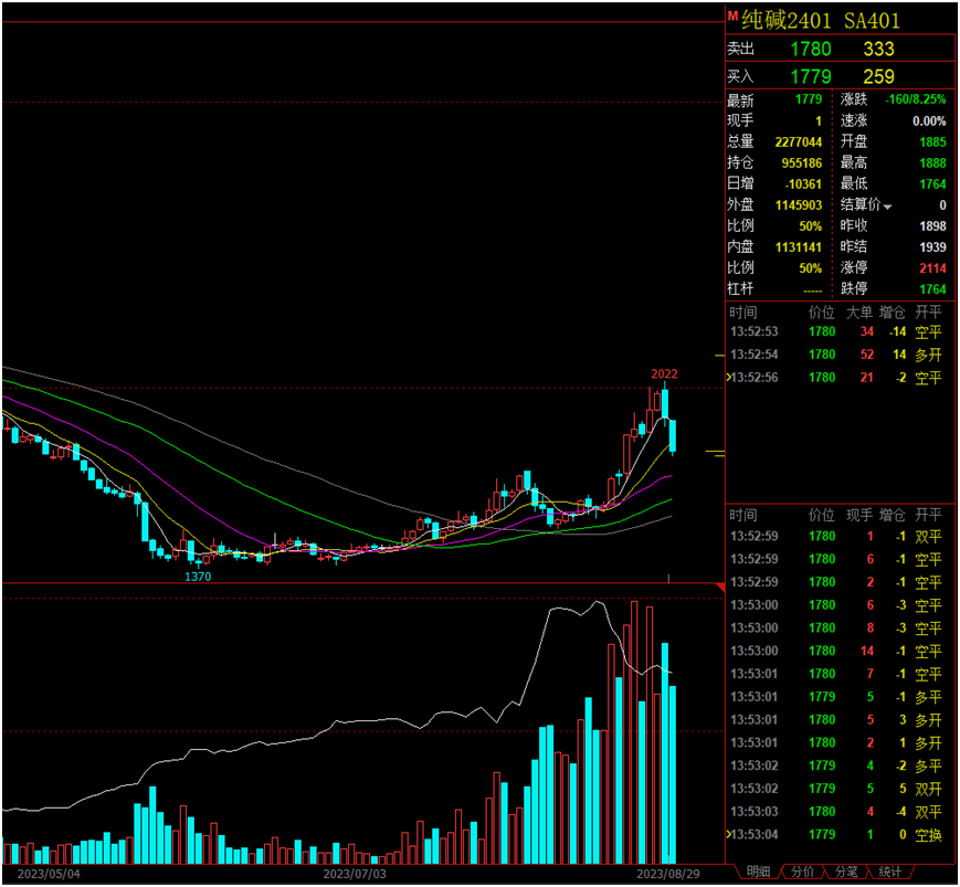 不过,从昨日午后开始,sa2401合约价格突然开始快速杀跌,今日盘中更是在消息面的影响下触及9%幅度跌停。截至今日14时05分左右,sa2401报1775元/吨,1天内已较高点回撤超过12%。