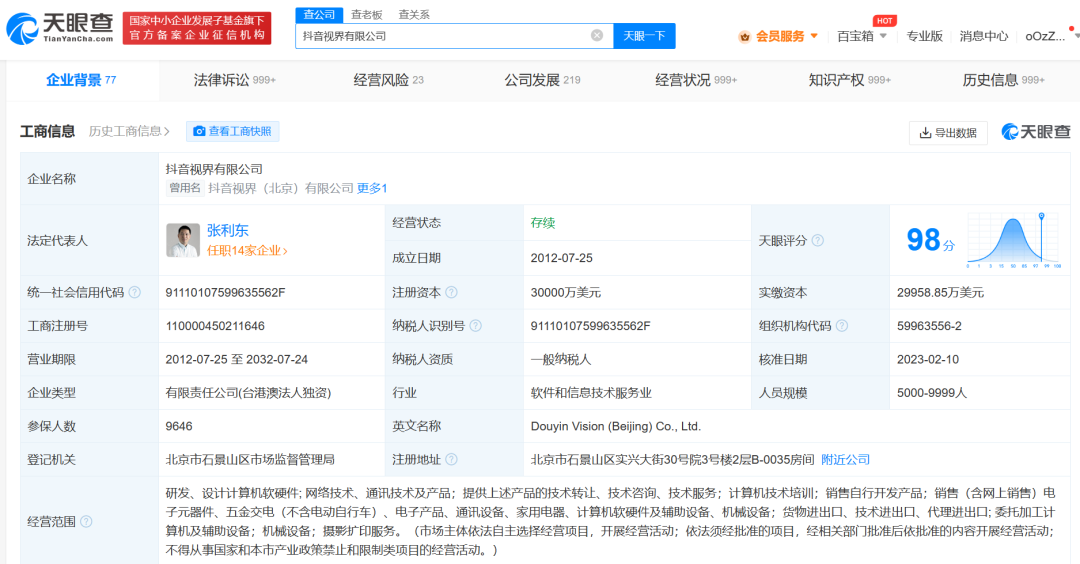 另悉,抖音视界有限公司成立于2012年7月,法定代表人为张利东,注册资本3亿美元,由抖音集团有限公司全资持股。抖音视界有限公司共对外投资了4家企业,参与招投标项目35次;知识产权方面有商标信息6572条,专利信息7543条,著作权信息493条;此外企业还拥有行政许可2个。