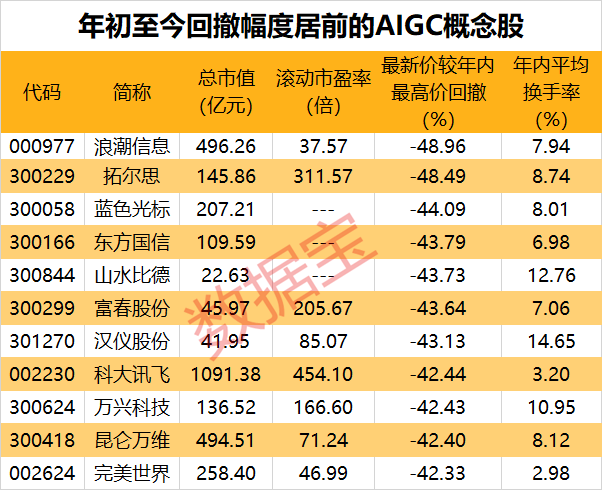 从风险角度来看,最新收盘价相对全年最高价回撤幅度超过40%的有11只,其中回撤最大的是浪潮信息,幅度为48.96%;排名其后的分别为拓尔思、蓝色光标、东方国信、山水比德等。