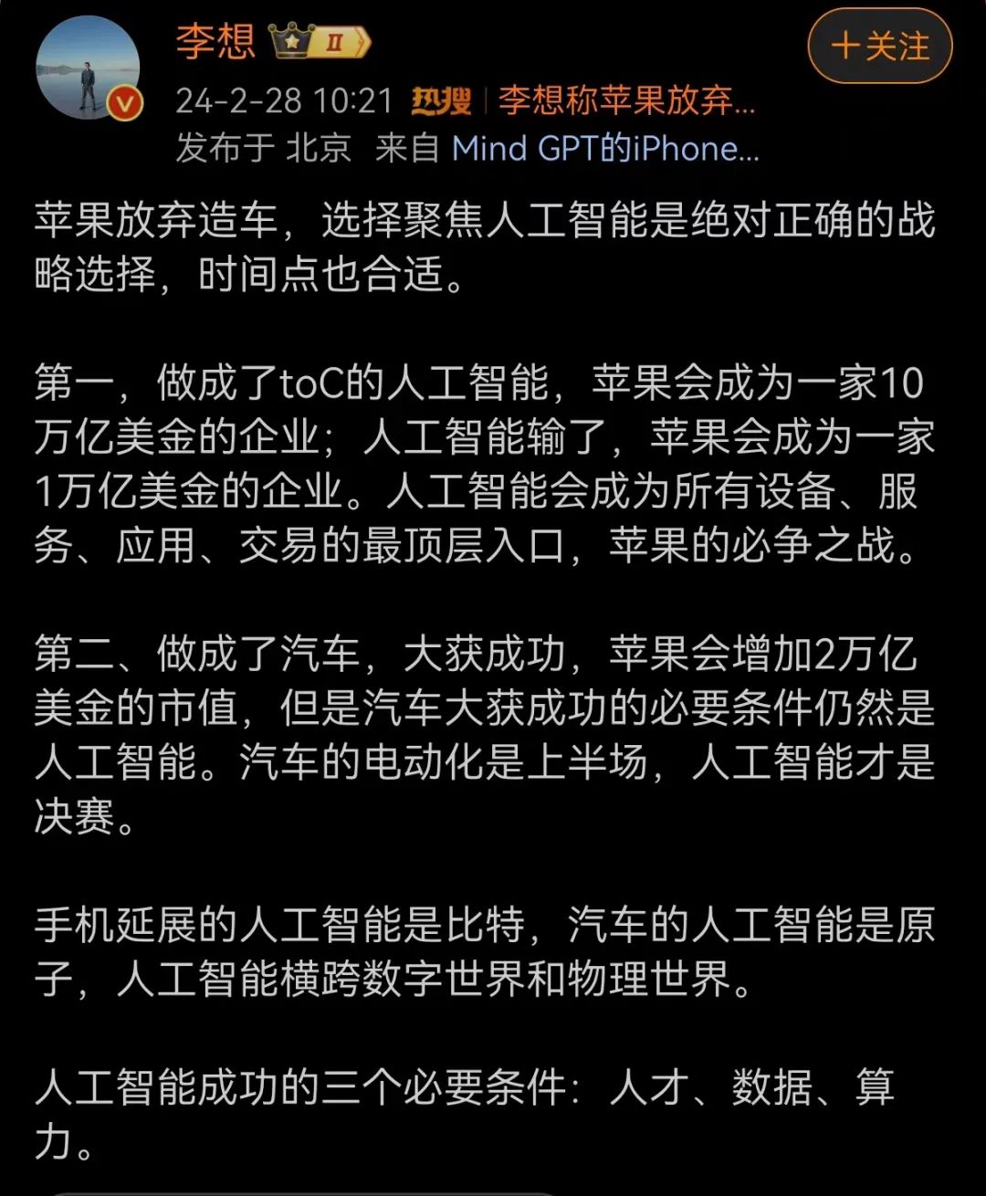 理想汽车ceo李想28日在微博发文称,苹果放弃造车,选择聚焦人工智能是绝对正确的战略选择,时间点也合适。