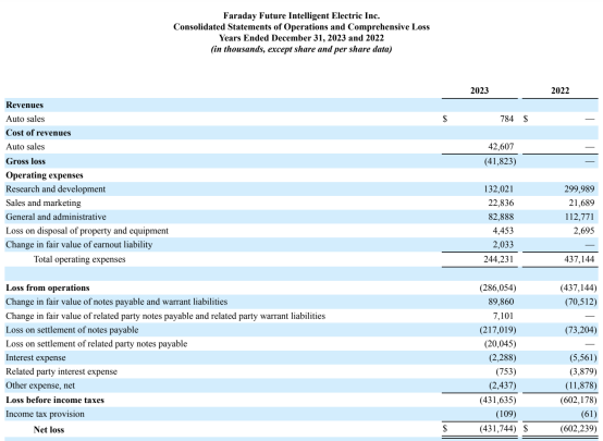 财报显示,2023年,法拉第未来营收78.4万美元,销售成本为4260.7万美元,上年营收和销售成本均为零;2022年全年净亏损6.02亿美元,2023年全年净亏损收窄至4.32亿美元。此外,法拉第未来表示,鉴于目前市场状况和当下资金水平,该公司将撤回其2024年生产目标指引。