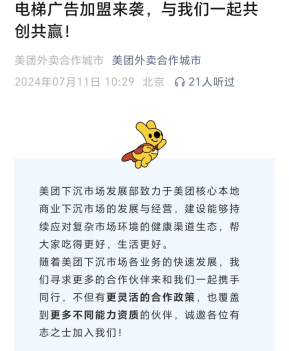 7月11日,“美团外卖合作城市”微信公众号发布消息,目前美团计划在下沉城市招募电梯媒体广告加盟商(视频梯媒)。美团侧将提供设备和业务支持;加盟商侧负责铺设设备、销售和制作广告等事宜。