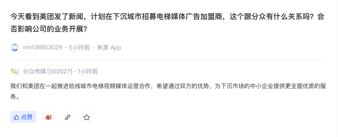 7月11日盘后,分众传媒通过互动平台,对美团入局电梯广告一事进行回应。公司表示,此次公司和美团系合作关系,公司将和美团一起推进低线城市电梯视频媒体运营合作,希望通过双方的优势,为下沉市场的中小企业提供更全面优质的服务。
