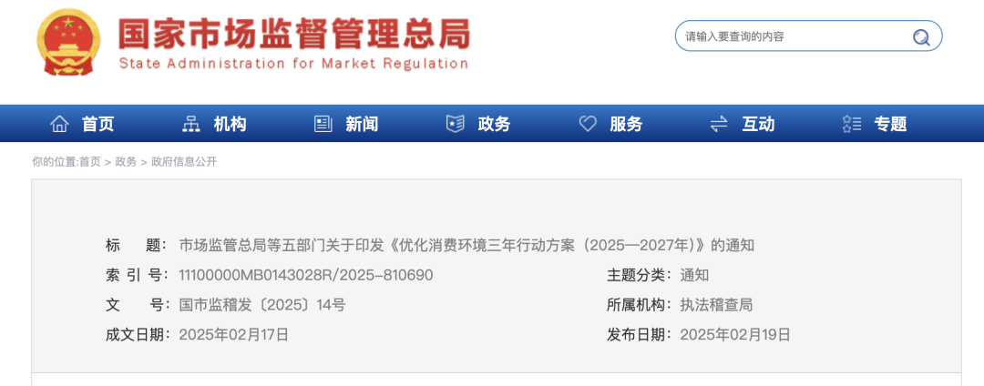 2月19日,市场监管总局等五部门印发《优化消费环境三年行动方案(2025—2027年)》(下称《方案》),从消费供给提质、消费秩序优化、消费维权提效、消费环境共治、消费环境引领等五大行动着手,提振消费信心。