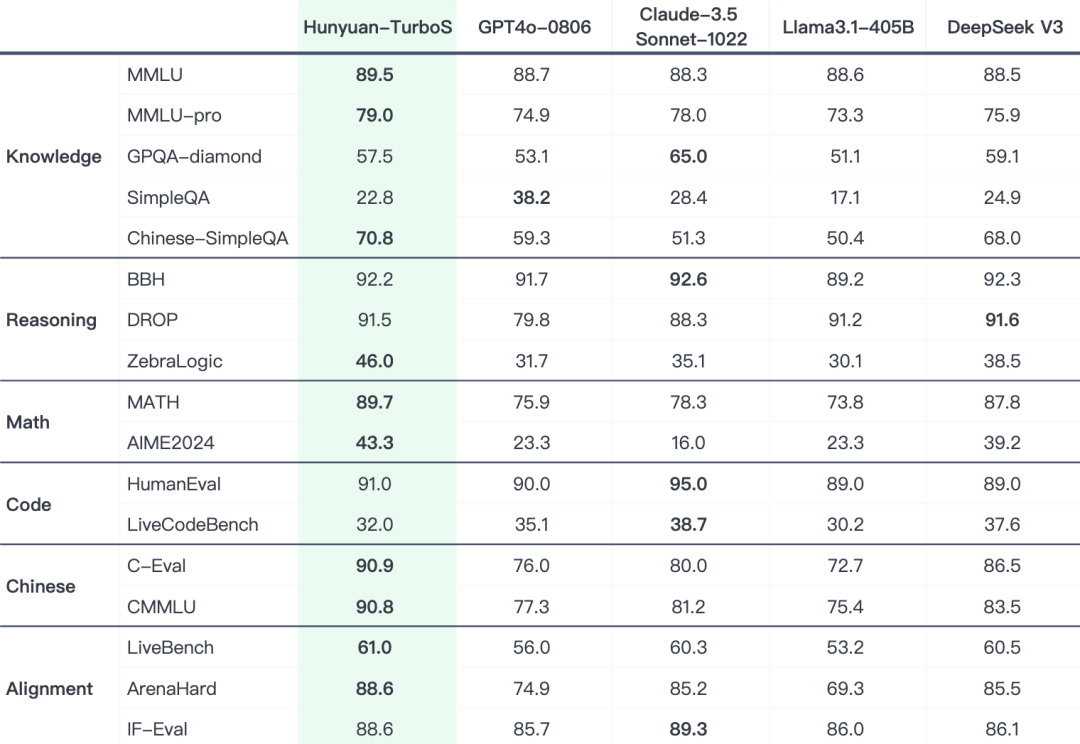 另据测评,在业界通用的多个公开benchmark上,腾讯混元turbo s在知识、数学、推理等多个领域展现出对标deepseek-v3、gpt-4o、claude3.5等业界领先模型的效果表现。