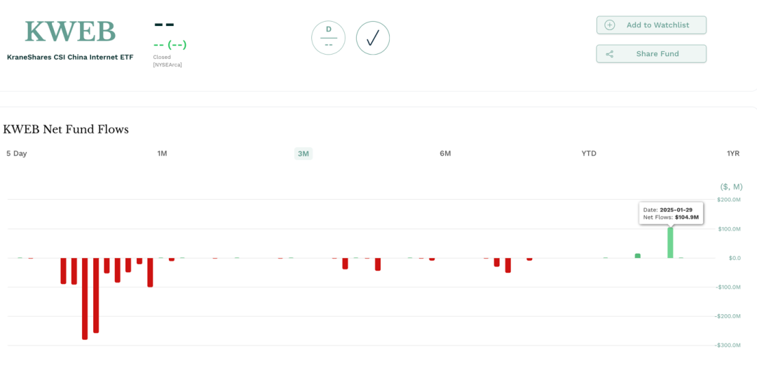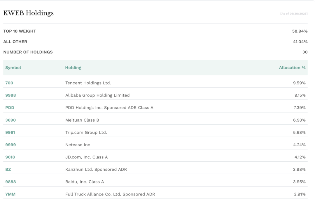 1月29日,跟踪中国海外互联网指数的etf kweb录得净流入1.05亿美元。时隔数月,kweb再度获显著资金净流入。kweb 跟踪中国互联网指数。该指数的前十大重仓股包括腾讯控股、阿里巴巴、拼多多、美团、携程、网易、京东、boss直聘(看准科技)、百度、满帮。