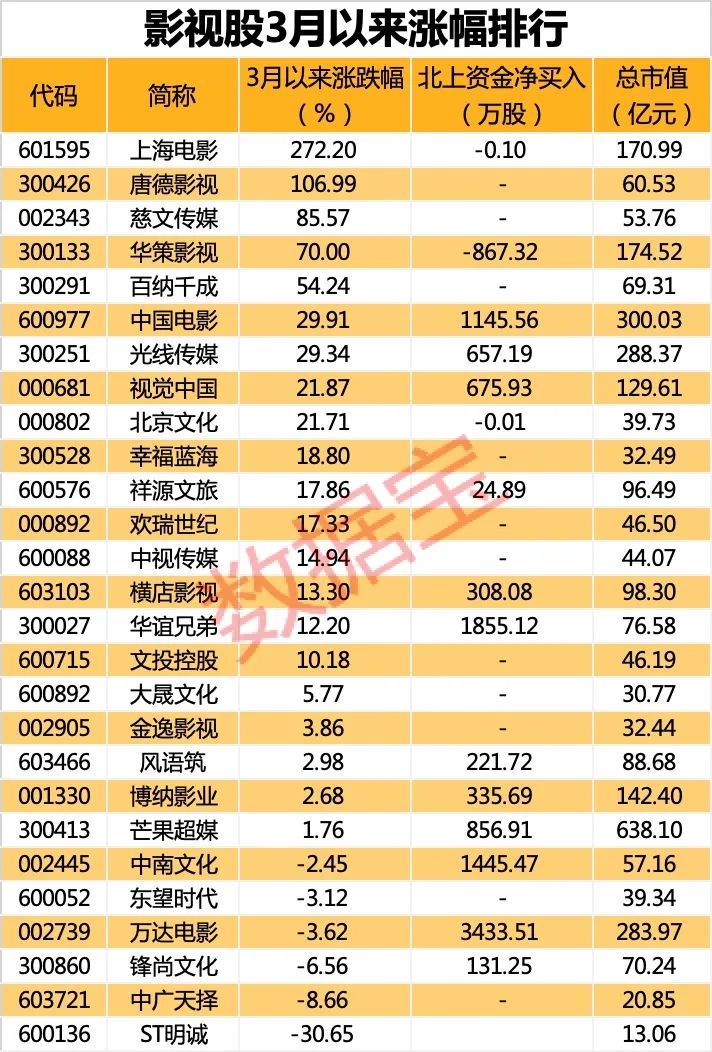 近期票房的强势表现提振影视行业复苏预期,板块个股明显上涨。证券时报·数据宝统计显示,3月以来,超七成影视股上涨,累计涨幅中位数达到13.3%;上海电影、唐德影视、慈文传媒涨幅居前,分别上涨272.2%、106.99%、85.57%。