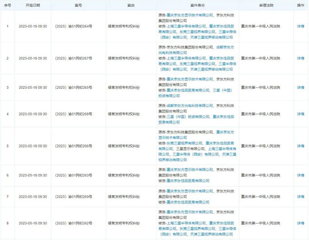 近日,天眼查网站显示,京东方科技集团股份有限公司新增多则开庭公告。原告还包括重庆京东方显示技术有限公司、成都京东方光电科技有限公司,被告则包括上海三星半导体有限公司、三星(中国)投资有限公司、东莞三星视界有限公司、三星半导体(西安)有限公司、天津三星视界移动有限公司等多家三星相关公司,以及重庆京东佳品贸易有限公司。