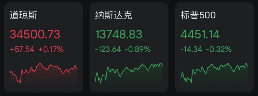 当地时间周四,美股集体低开,随后跌幅有所收窄,三大指数收盘涨跌不一。截至收盘,道指涨0.17%报34500.73点,标普500指数跌0.32%报4451.14点,纳指跌0.89%报13748.83点。