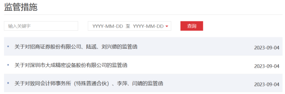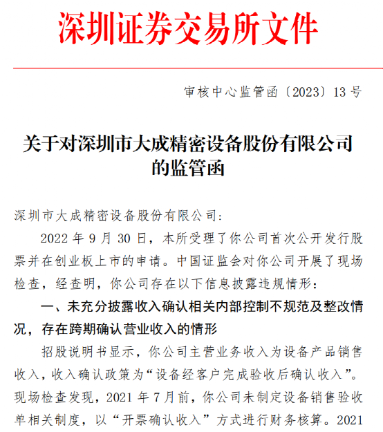 9月4日,深交所发布三则监管函,对此前拟在创业板ipo的深圳市大成精密设备股份有限公司、招商证券、致同会计师事务所,以及两家中介机构的相关人员采取书面警示的自律监管措施。