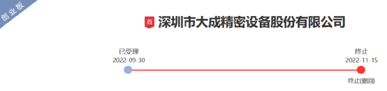 2022年11月14日,深交所发文称,由于大成精密申请撤回发行上市申请文件,根据《深交所创业板股票发行上市审核规则》第六十七条,决定终止对其创业板ipo的审核。