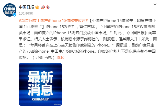 对此,《中国日报》向苹果求证。相关人士表示,该消息来源于彭博社的一则报道,但其原文并非如此,而是:“苹果将首次在上市当天销售印度制造的iphone。”
