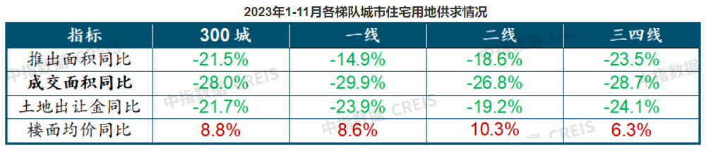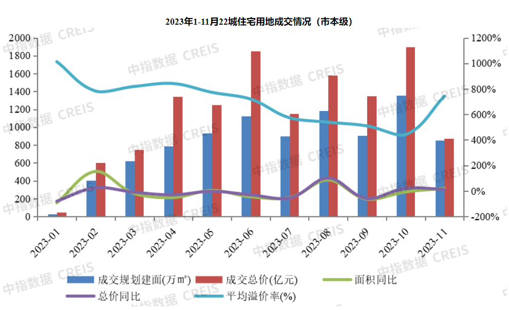中指研究院的最新数据显示,1-11月,全国300城共推出住宅用地规划建筑面积56757.05万平方米,同比下降21.16%;成交规划建筑面积33801.99万平方米,同比下降27.72%;住宅用地出让金达21674.44亿元,同比下降21.42%;成交楼面均价为6407元/平方米,同比上涨8.62%;平均溢价率为5.37%,较去年同期增长2.06个百分点;共流拍地块835宗,流拍率为17.11%,较去年同期增长0.01个百分点。