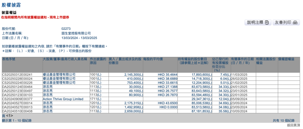 3月12日,港交所披露易披露的公告显示,3月11日,睿远基金以每股35.4644港元的均价增持了214.53万股固生堂(02273.hk)。而在此前2月21日、2月26日,睿远基金分别增持固生堂75.34万股、41万股。