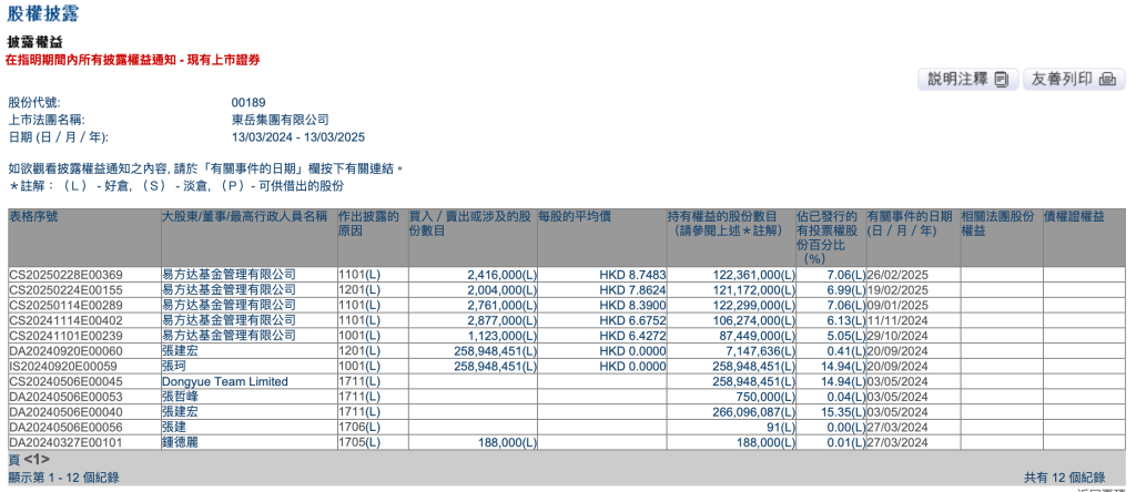 与此同时,根据港交所披露的信息,易方达基金则于2月26日以每股8.7483港元的均价增持了东岳集团(00189.hk)241.6万股,总金额约2113.59万港元。此次增持后,易方达基金持有东岳集团的股份数量增至1.22亿股,持股比例达到7.06%。