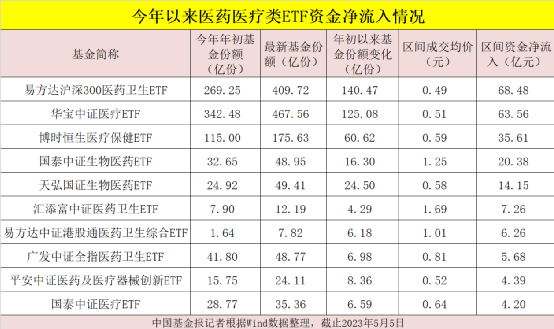 尽管医药行情震荡,但今年资金越跌越买的势头明显。数据显示,截止今年5月5日,年初以来全市场30只医药医疗类etf,总共份额猛增421.38亿份,合计资金净流入将近245亿元。