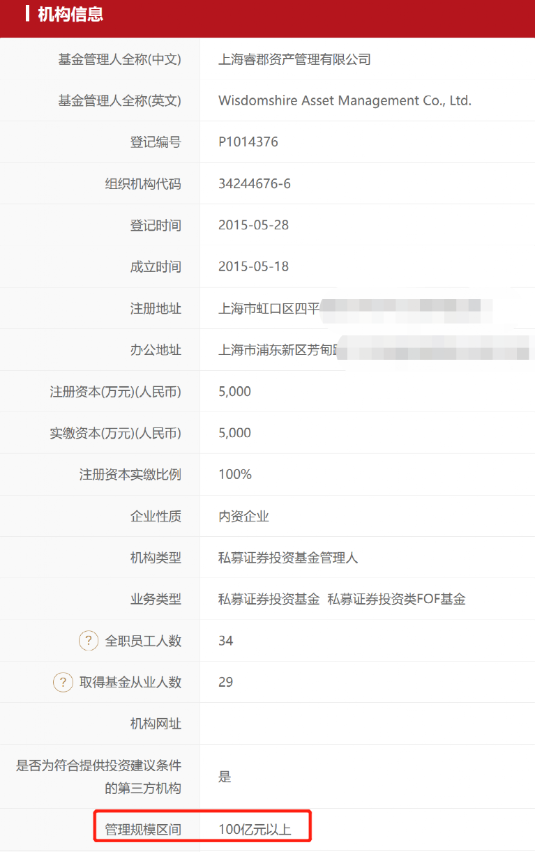 资料显示,上海睿郡资产管理有限公司成立于2015年5月18日,2015年5月28日完成私募证券投资基金管理人备案登记。公司最新注册资本为5000万元,目前有34名员工。