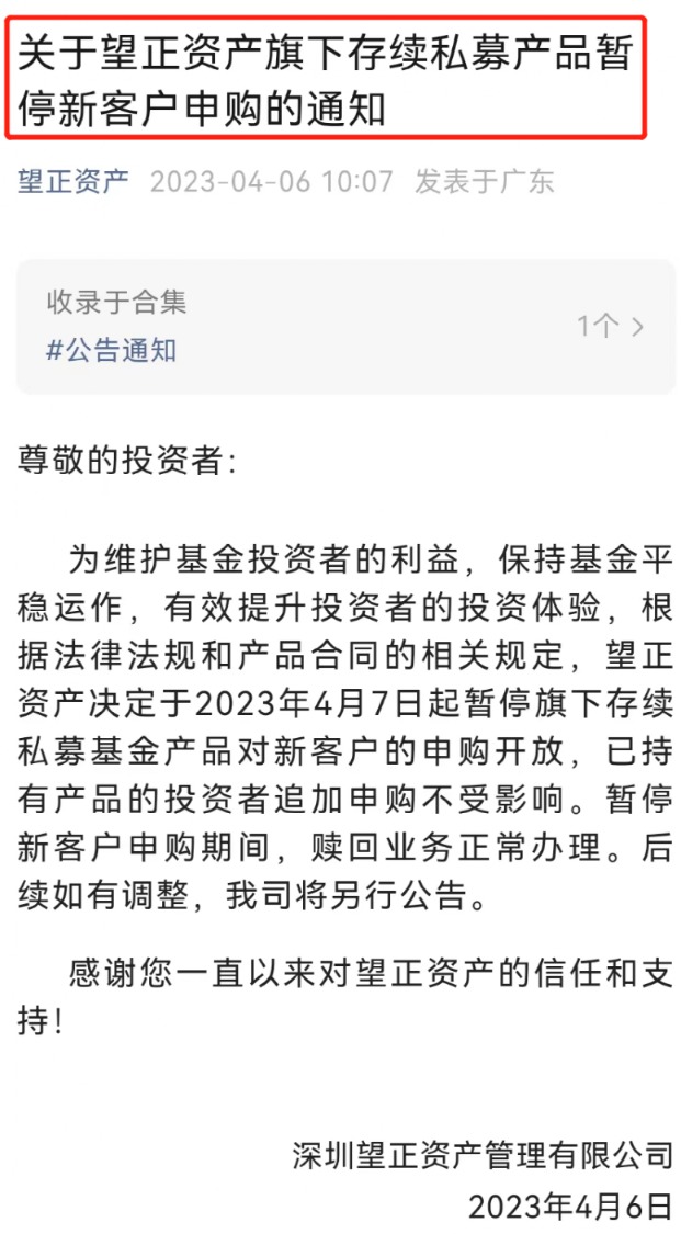 4月6日,王鹏辉掌舵的百亿级私募望正资产发布公告称,为维护基金投资者的利益,保持基金平稳运作,有效提升投资者的投资体验,公司决定于2023年4月7日起暂停旗下存续私募基金产品对新客户的申购开放,已持有产品的投资者追加申购不受影响,暂停新客户申购期间,赎回业务正常办理。