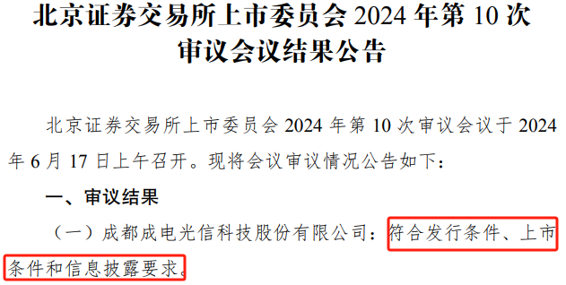 根据北交所k8凯发赢家一触即发官网公告,北交所上市委员会2024年第10次审议会议于2024年6月17日上午召开,成都成电光信科技股份有限公司(以下简称成电光信)的审议结果是“符合发行条件、上市条件和信息披露要求”。