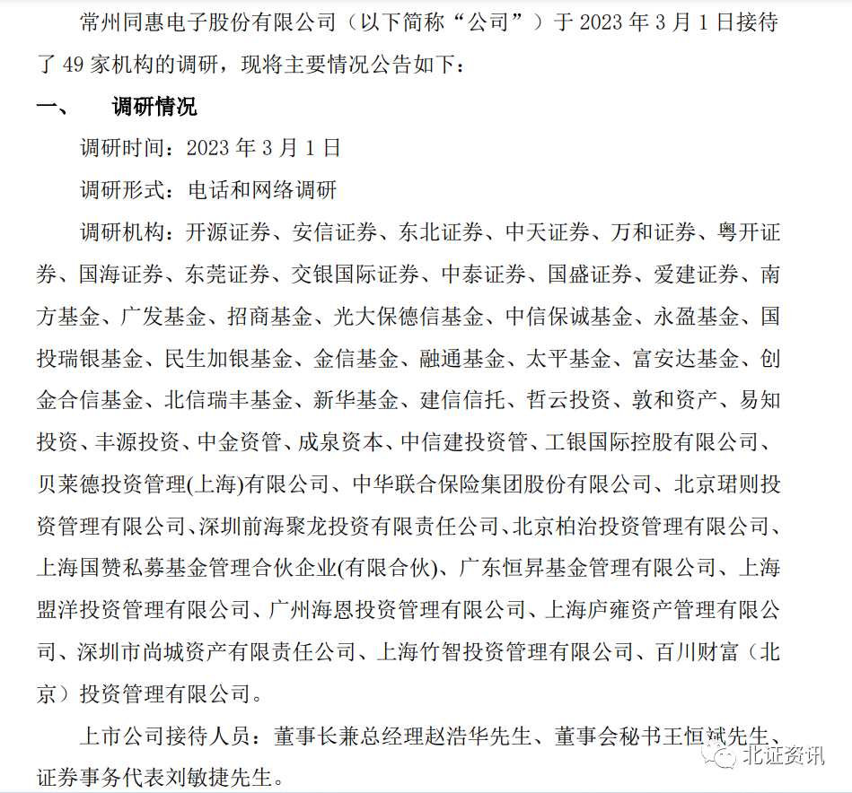 同惠电子今天公告称,于3月1日接待了49家机构的调研,涉及机构包括券商、基金、信托、保险、资管、私募和创投公司。
